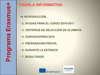 Este documento proporciona información sobre el Programa Erasmus+ para la educación superior. Explica que el programa permite a los estudiantes de ciclos formativos de grado superior realizar prácticas en empresas en otros países de la UE, desarrollando sus competencias profesionales y lingüísticas. Detalla los criterios de selección, el proceso de solicitud, los pasos de preparación, el apoyo durante la estancia y los resultados esperados del programa.
