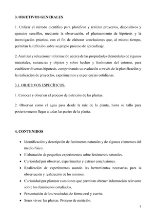 Este documento describe dos experimentos sobre cómo se alimentan y crecen las plantas realizados con estudiantes. En el primer experimento, los estudiantes observan cómo el agua con colorante sube por la planta a través de la raíz y el tallo hasta llegar a las hojas y flores. En el segundo experimento, los estudiantes siembran semillas y observan cómo crecen con el paso del tiempo a medida que reciben agua y luz solar. Los experimentos tienen como objetivo enseñar a los estudiantes sobre los procesos de nutrición y crecimiento