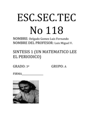 Este documento resume la primera síntesis de un libro sobre un matemático que lee el periódico. Explica que el matemático, John Allen Paulos, analiza con detalle el contenido y estructura de un periódico, encontrando información valiosa sobre economía y política en noticias aparentemente simples. La conclusión enfatiza la importancia de leer críticamente el periódico para captar los mensajes subyacentes.