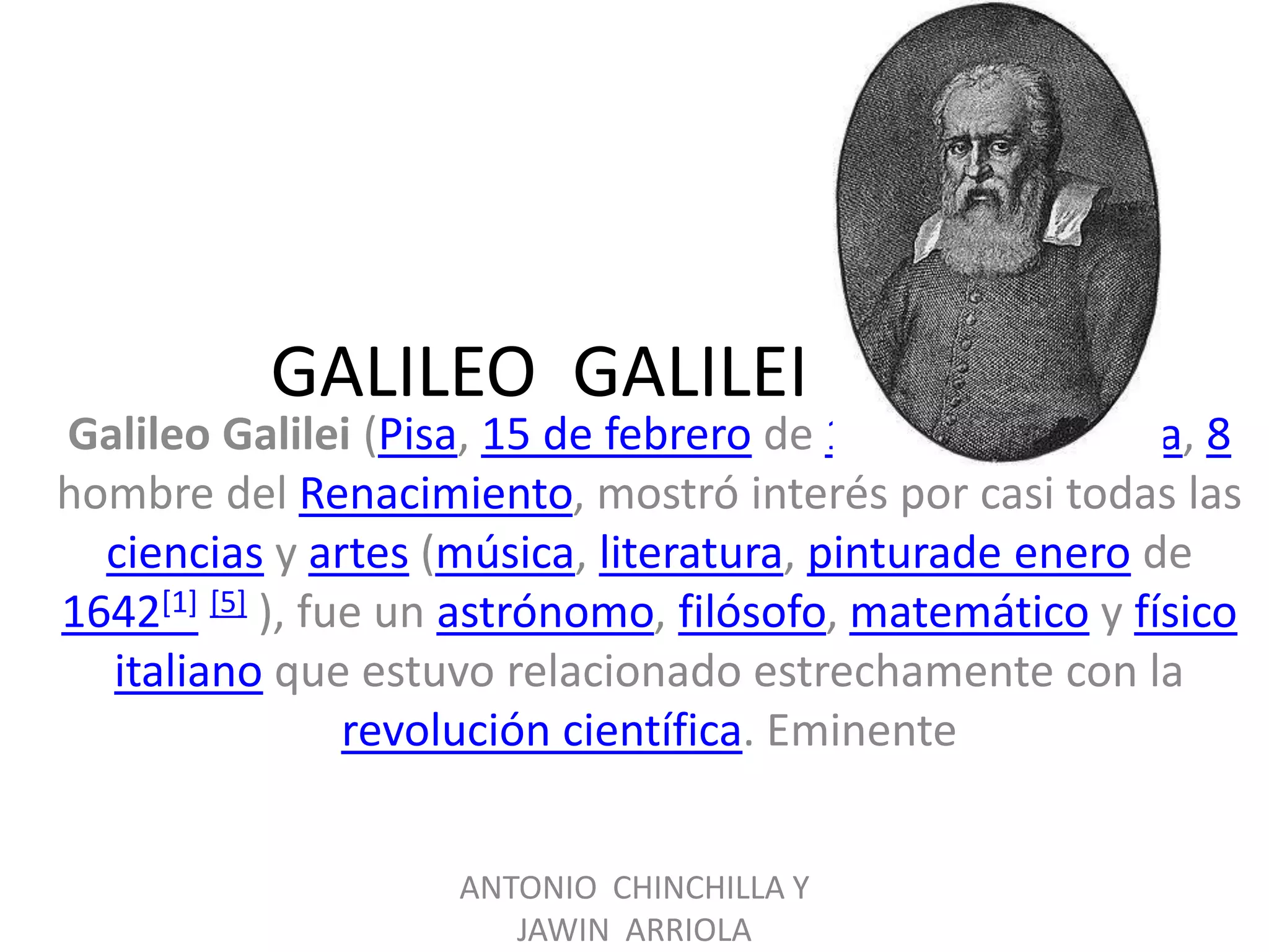 El documento presenta información sobre varios científicos importantes como Galileo Galilei, Albert Einstein, Isaac Newton, Gregor Mendel y Alexander Fleming, describiendo brevemente sus contribuciones a la ciencia y los descubrimientos que realizaron en campos como la astronomía, la física, la matemática, la genética y la medicina.