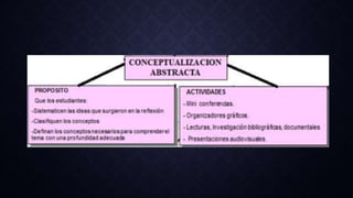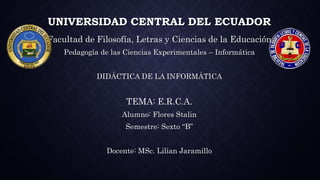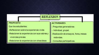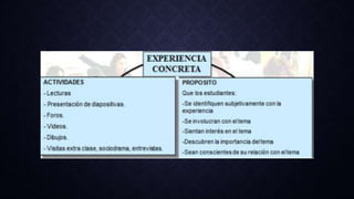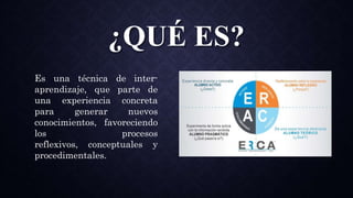El documento describe la técnica de aprendizaje E.R.C.A. (Experiencia, Reflexión, Conceptualización, Aplicación), la cual consiste en partir de una experiencia concreta para generar nuevos conocimientos a través de procesos reflexivos. Explica cada una de las etapas de la técnica y las actividades que debe realizar el docente en cada etapa, como conseguir la atención de los estudiantes, propiciar la reflexión, presentar información de forma sistemática, y permitir que los estudiantes apliquen lo