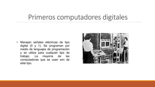 Este documento resume las generaciones de computadoras, desde los primeros computadores digitales y comerciales en los años 1950 y 1960, el desarrollo del circuito integrado y Silicon Valley, los minicomputadores y supercomputadores, la revolución del microprocesador, y la llegada de las computadoras caseras. También cubre brevemente la historia de las telecomunicaciones, Internet, teléfonos inteligentes y redes sociales.
