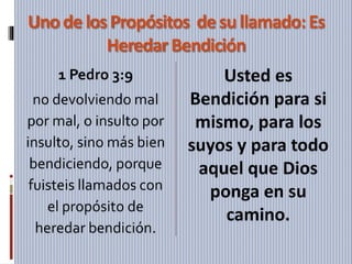 El documento enfatiza que la comunidad cristiana internacional Shekinah de Dios es llamada a heredar bendición según 1 Pedro 3:9, fomentando la importancia de bendecir a otros. Se expone que todos los creyentes en Jesucristo comparten las bendiciones prometidas a Abraham, y se destaca la necesidad de vivir alineados con la voluntad de Dios para recibirlas plenamente. Además, se menciona que rechazar la primogenitura o vivir en desobediencia puede resultar en la pérdida de estas bendiciones.