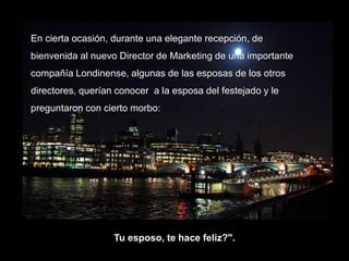 La esposa del nuevo Director de Marketing respondió que su esposo no la hace feliz cuando otras esposas le preguntaron. Explicó que ella es la única responsable de su propia felicidad y que ha aprendido a decidir ser feliz independientemente de las circunstancias o los cambios en su vida y en los demás. Afirmó que el amor verdadero y el perdón incondicional son la base de la felicidad en una relación, y no depende de otra persona hacerte feliz.