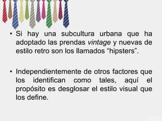 Los hipsters se caracterizan por usar ropa vintage y de estilo retro, ya sea prendas antiguas o nuevas que imitan ese estilo. Les gusta darle nuevo uso a objetos viejos y lucir artículos artesanales. A menudo usan lentes grandes de apariencia retro y dejan que su cabello luzca despreocupado aunque en realidad lo cuiden mucho.