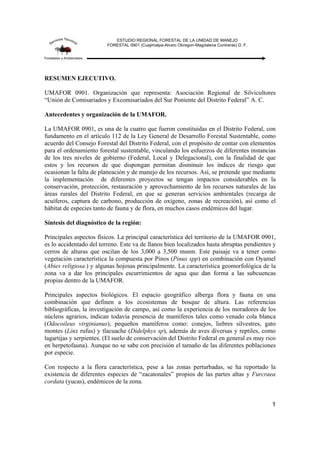 Este documento presenta un Estudio Regional Forestal de la Unidad de Manejo Forestal 0901 en la Ciudad de México. El estudio describe la ubicación, características físicas y biológicas de la región, los usos del suelo, la tenencia de la tierra, los impactos ambientales y las organizaciones comunitarias. El estudio concluye con lineamientos de política para fortalecer la conservación y gestión sostenible de los recursos forestales de la región, incluyendo mecanismos de pago por servicios ambientales y programas