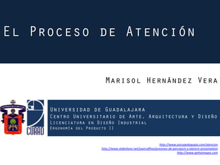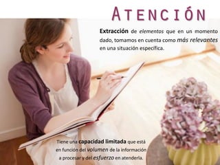 La atención es el proceso que permite filtrar y seleccionar la información más relevante de nuestro entorno. Está regulada por el sistema activador reticular ascendente y áreas cerebrales como el tallo cerebral, córtex límbico y región frontal. La atención puede ser selectiva, dividida o sostenida, e influyen en ella factores como la motivación, emoción y estado orgánico de una persona.