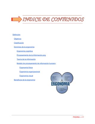 Este documento presenta una introducción a la ergonomía, definiéndola, clasificándola en diferentes dominios como la ergonomía cognitiva, física y organizacional, y describiendo brevemente cada uno. También destaca los beneficios de aplicar principios ergonómicos como mejorar la salud, seguridad y bienestar de los trabajadores.