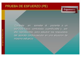 Este documento describe la prueba de esfuerzo ergométrica. Consiste en someter al paciente a ejercicio físico controlado y cuantificable en una cinta de correr o bicicleta ergométrica para estudiar la respuesta cardiovascular bajo máximo esfuerzo. Se detallan los protocolos, equipamiento necesario, preparación del paciente, desarrollo de la prueba y cuidados de enfermería requeridos.