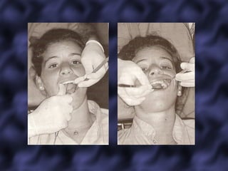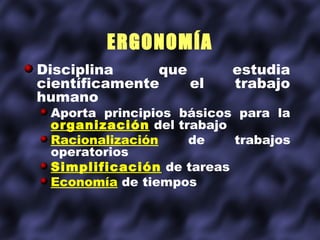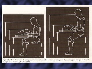 Este documento trata sobre la ergonomía en odontología. Explica conceptos como la racionalización del trabajo, la fatiga laboral, principios de simplificación de tareas y economía de movimientos. También describe posiciones correctas del paciente, operador y asistente, así como maniobras básicas en la técnica de cuatro manos. El objetivo final es mejorar la productividad y calidad del trabajo odontológico preveniendo trastornos musculoesqueléticos.