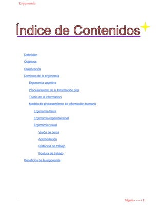 Este documento trata sobre la ergonomía. Define la ergonomía como la aplicación de conocimientos científicos para adaptar el trabajo, sistemas, productos y ambientes a las capacidades humanas. Explica que la ergonomía se divide en varios dominios como la ergonomía cognitiva, física, organizacional y visual. Finalmente, destaca algunos beneficios de aplicar principios ergonómicos como prevenir lesiones y mejorar el bienestar en el trabajo.