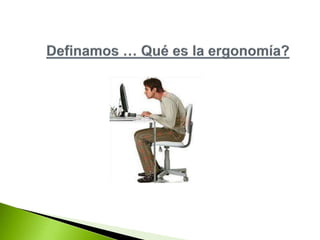 El documento trata sobre la ergonomía y los trastornos musculoesqueléticos relacionados con el trabajo. Explica que la ergonomía busca diseñar los puestos de trabajo y tareas para prevenir lesiones mediante la compatibilidad con la capacidad humana. Identifica factores de riesgo como la fuerza, posturas y tareas repetitivas. Reconoce que los programas de ergonomía que incluyen evaluación de riesgos, control de ingeniería y educación son efectivos para prevenir y manejar trastornos musculoesquelé