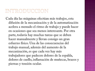 El documento habla sobre la ergonomía y sus objetivos. Explica que la ergonomía busca adaptar el puesto de trabajo al trabajador para evitar problemas de salud y aumentar la eficiencia, diseñando herramientas y máquinas considerando las diferencias entre las personas. También identifica factores de riesgo como la repetición, fuerza excesiva, posturas incómodas y vibraciones que pueden afectar la salud de los trabajadores. El objetivo principal de la ergonomía es optimizar la relación entre humanos y máquinas para mejor