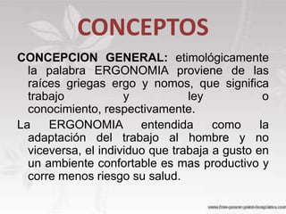 Este documento ofrece una introducción general a la ergonomía. Define la ergonomía como la adaptación del trabajo al hombre para maximizar la productividad y minimizar los riesgos para la salud. Explica que la ergonomía estudia la interacción entre el hombre, los objetos y el ambiente de trabajo. También clasifica los diferentes enfoques de la ergonomía y analiza factores de riesgo como la carga física y posturas inadecuadas que pueden causar fatiga y lesiones.