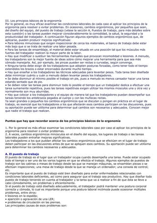 Los principios básicos de la ergonomía incluyen examinar las condiciones laborales caso por caso y realizar cambios ergonómicos minúsculos que pueden mejorar la comodidad, salud y seguridad de los trabajadores. Los trabajadores deben participar en las discusiones sobre cambios ergonómicos ya que conocen mejor su trabajo y pueden determinar los cambios necesarios y adecuados.