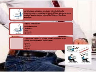 Este documento trata sobre varios temas relacionados con la ergonomía, incluyendo factores ambientales en el puesto de trabajo como la temperatura y la iluminación, posturas correctas para levantar cargas, la ergonomía cognitiva que estudia la interacción entre humanos y máquinas, la ergonomía preventiva que analiza las condiciones de seguridad y salud laboral, y la ergonomía de necesidades específicas que se enfoca en diseñar equipos para personas con discapacidades.