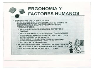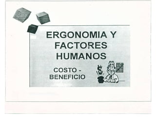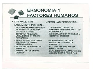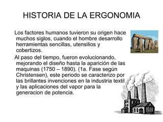 La ergonomía surgió como disciplina en la década de 1950 para estudiar la interacción entre los seres humanos y sus entornos de trabajo. Se basa en campos como la fisiología, la psicología y la ingeniería para optimizar la seguridad, eficiencia y comodidad de los sistemas hombre-máquina. La ergonomía se aplica al diseño de tareas, equipos, productos y entornos de trabajo para adaptarlos a las capacidades humanas y reducir la fatiga y los errores.