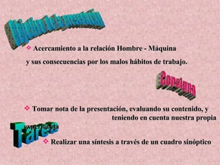 Este documento ofrece consejos sobre la adaptación hombre-máquina y el uso ergonómico de la computadora para evitar lesiones. Explica que una mala postura, iluminación y hábitos de trabajo pueden causar dolores y lesiones. Recomienda adoptar una postura correcta, tomar descansos, mantener una distancia adecuada al monitor, y seguir otras reglas como el uso de un teclado y mouse a la altura adecuada. También sugiere soluciones económicas cuando no se cuenta con equipos ergonómicos ideales.