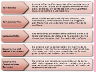 Este documento identifica y describe los principales riesgos ergonómicos en el lugar de trabajo, incluidas las posturas forzadas, los movimientos repetitivos, la manipulación manual de cargas y la aplicación de fuerzas. Explica cómo la ergonomía estudia la relación entre el trabajo y el entorno para prevenir problemas de salud. También proporciona ejemplos de riesgos ergonómicos comunes y medidas preventivas para crear un entorno de trabajo más seguro y saludable.