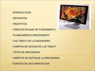 La ergonomía es una disciplina que se basa en ciencias como la psicología, fisiología y biomecánica. Tiene como objetivo adaptar productos, tareas y ambientes a las capacidades y necesidades humanas para mejorar la eficiencia, seguridad y bienestar. La ergonomía incluye el diseño de productos, puestos de trabajo y la organización. Analiza factores como las posturas, esfuerzos, campos visuales y riesgos para crear entornos que se ajusten a las personas.