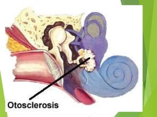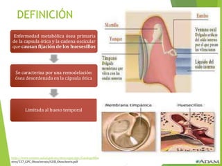 La otosclerosis es una enfermedad ósea primaria de la cápsula ótica y la cadena oscicular que causa fijación de los huesecillos. Se caracteriza por una remodelación ósea desordenada en la cápsula ótica que limita la audición de tipo conductiva. Generalmente es bilateral y más común en mujeres entre los 15-45 años. El tratamiento incluye observación, amplificación, medicamentos como el fluoruro de sodio o cirugía como la estapedectomía.
