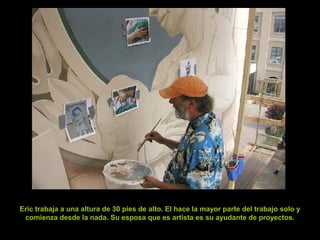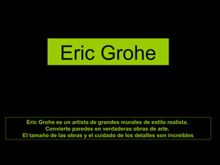 Eric Grohe es un artista de murales realistas que convierte paredes lisas en obras de arte tridimensionales a gran escala. Trabaja solo o con su esposa como asistente a 30 pies de altura, comenzando sin boceto y dando forma a la pared hasta completar increíbles detalles. Incluye ejemplos de paredes antes y después de ser pintadas por Eric, mostrando la transformación de superficies planas en escenas realistas.