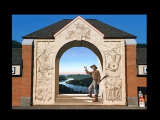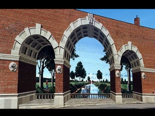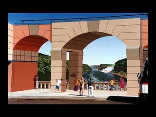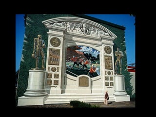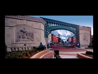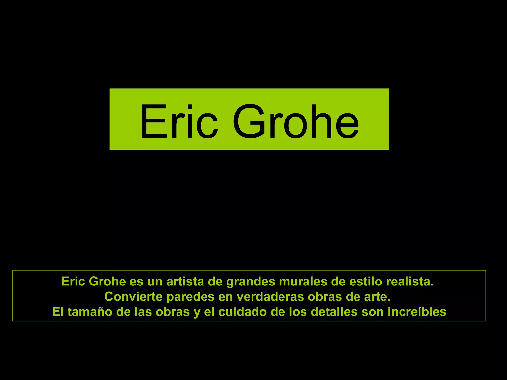 Eric Grohe es un artista de murales realistas que convierte paredes lisas en obras de arte tridimensionales a gran escala. Muestra antes y después de varios proyectos donde transforma paredes de edificios y calles mediante detallados murales que ilustran escenas realistas. Trabaja solo o con su esposa como asistente, pintando en alturas de hasta 30 pies para crear la ilusión de profundidad en superficies planas.