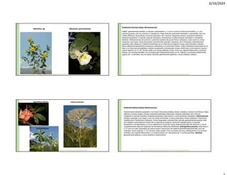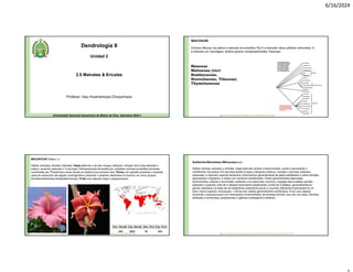 El documento describe características botánicas de diversas familias de plantas, incluyendo Malvaceae y Ericaceae, señalando hábitos, morfología, hojas, flores y frutos. Se menciona información específica sobre especies como Abutilon peruvianum y Ceiba pentandra, abarcando aspectos de su ecología, distribución y usos forestales. Además, se incluyen detalles sobre la fenología y la regeneración natural de las especies discutidas.