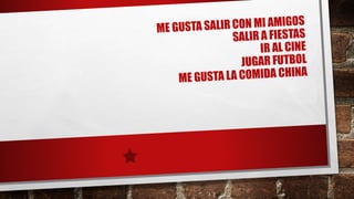 El documento expresa desagrado por fumar, beber, la hipocresía y la humillación hacia otros. Por otro lado, destaca aspectos positivos como la sonrisa, los ojos, la boca y la personalidad del hablante. También menciona rasgos negativos, como ser burlón y experimentar desespero con rapidez.