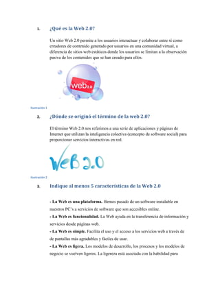 Este documento describe las características de la Web 2.0, incluyendo que permite a los usuarios interactuar y colaborar como creadores de contenido. Explora las diferencias entre la Web 1.0 y la Web 2.0, y menciona herramientas como blogs, wikis, redes sociales y RSS. También discute las características anticipadas de la Web 3.0 como inteligencia y ubicuidad.