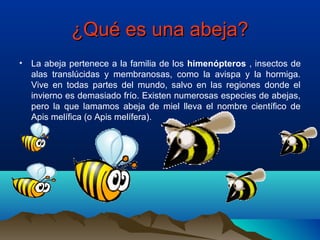 Las abejas pertenecen a la familia de los himenópteros e incluyen numerosas especies, aunque la más conocida es la abeja de miel. Viven en colmenas donde construyen panales de cera con celdas hexagonales para almacenar miel, polen y crías. Dentro de la colmena, la reina pone huevos mientras que las obreras se encargan de las tareas de limpieza, alimentación de larvas, recolección de polen y néctar, y construcción de panales. Los z