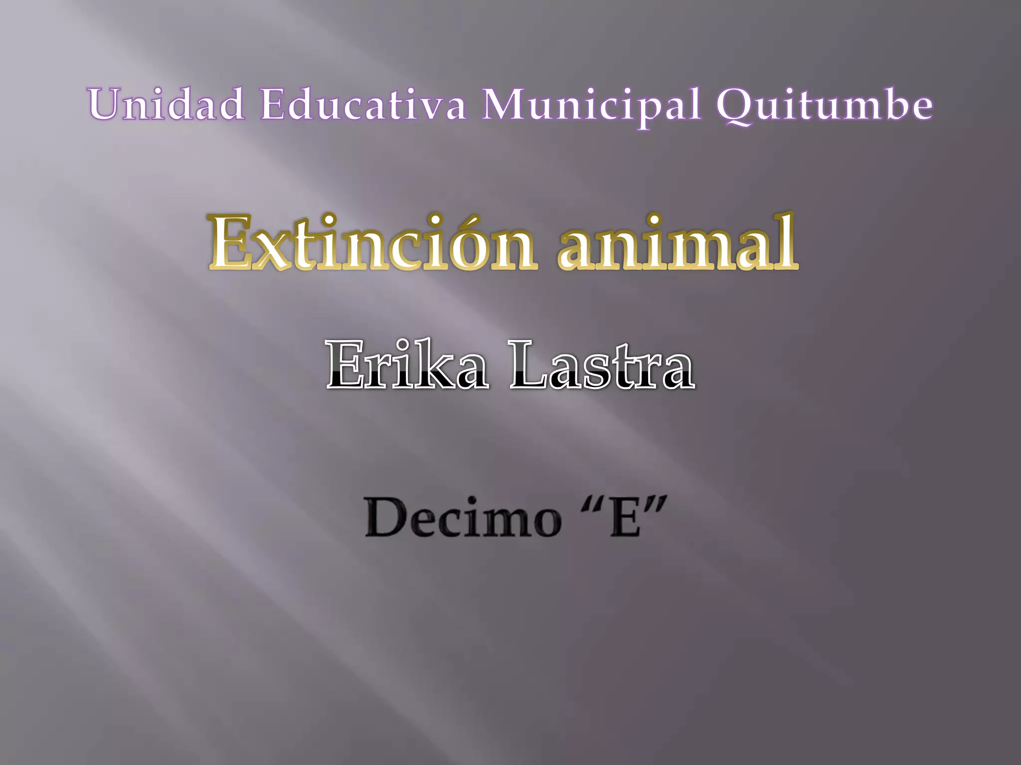 El documento describe varias especies animales amenazadas de extinción debido a factores como el cambio climático, la caza, la destrucción de hábitat y la pérdida de población. Entre ellas se encuentran orangutanes, tortugas marinas, pingüinos, elefantes, osos pandas, cocodrilos del río Yangtzee, zorros voladores de las islas Bonin, rinocerontes de Java y linces ibéricos.