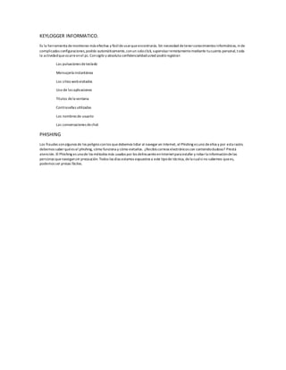 Los virus informáticos son programas que se ejecutan en una computadora para alterar o dañar datos y aplicaciones. Existen diferentes tipos de malware, incluidos gusanos y troyanos, que se propagan o acceden a sistemas bajo la apariencia de programas legítimos. También se destaca la importancia de la prevención contra el phishing, una técnica común utilizada para robar información en línea.