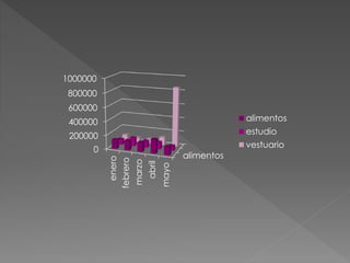 La tabla muestra la cantidad de productos vendidos y su valor correspondiente para cinco categorías a lo largo de cinco meses. Otra tabla muestra la cantidad gastada en alimentos cada mes durante un año.
