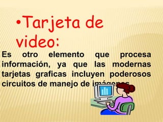 Las principales partes de una computadora incluyen la tarjeta de video que procesa imágenes, la tarjeta madre que comunica el procesador y circuitos auxiliares, y la memoria que almacena temporalmente los datos del procesador.