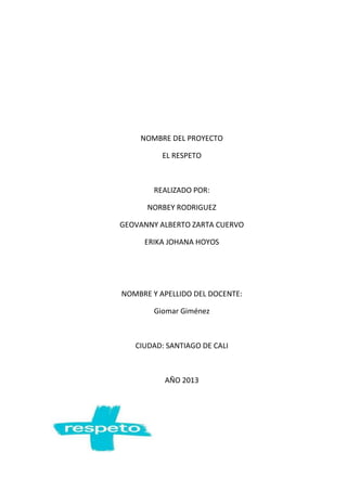 Este documento presenta un proyecto escolar sobre el valor del respeto realizado por tres estudiantes de décimo grado. Explica que el respeto implica reconocer el valor propio y de los demás, ser tolerante, y comportarse de manera respetuosa en la familia, la escuela y lugares públicos. También destaca la importancia de cumplir con las responsabilidades académicas y valorar cómo el respeto contribuye a una sociedad armoniosa.