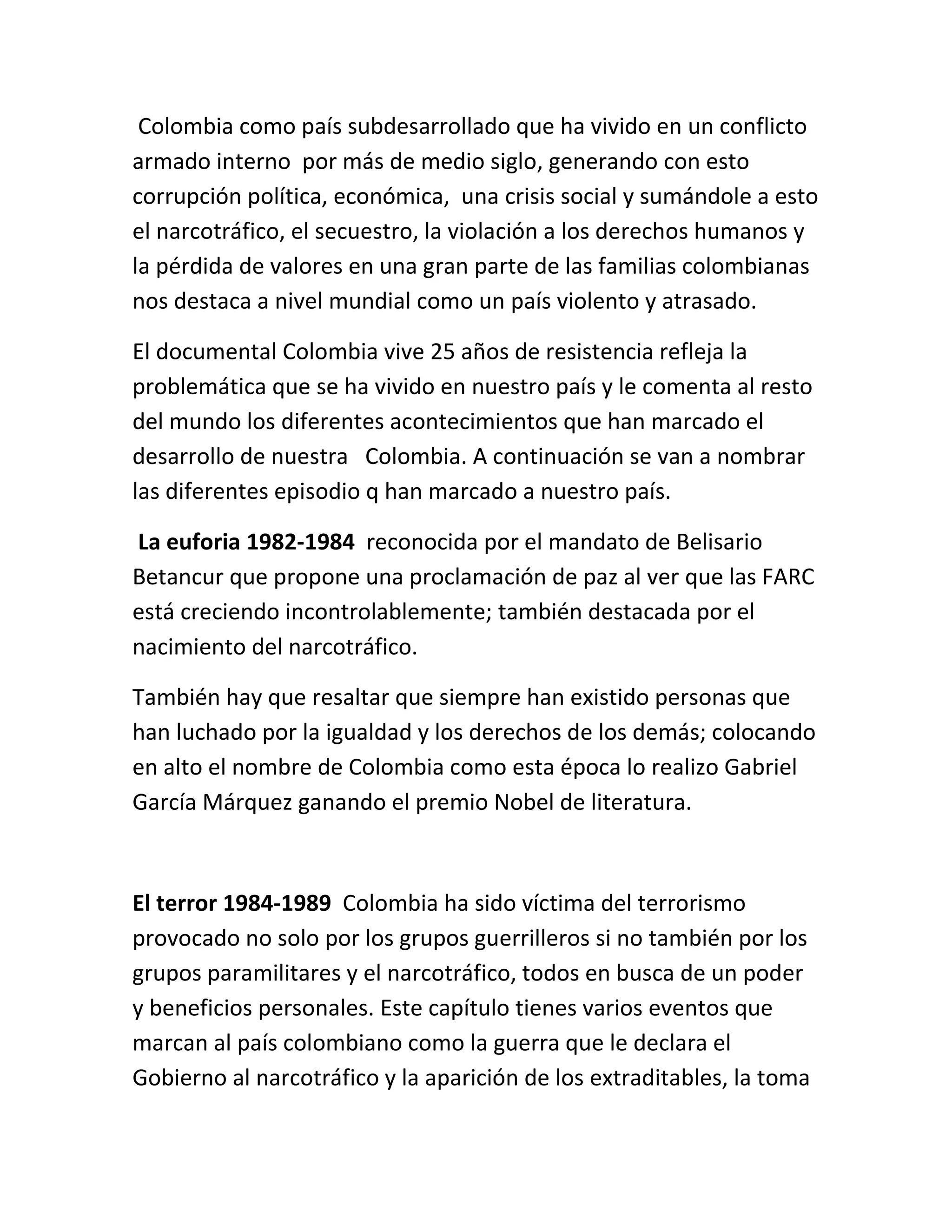El documento resume los principales eventos y períodos en la historia reciente de Colombia, caracterizados por conflictos internos, violencia, corrupción y narcotráfico. Se describen las épocas de la euforia en los años 80, el terror en la década de 1980, la lucha violenta en los 90, la confusión en los 90 también, la ilusión del proceso de paz fallido en 1998-2002, y la ansiedad y alegría de los años posteriores bajo el gobierno de Álvaro Uribe. A pesar de los desafíos