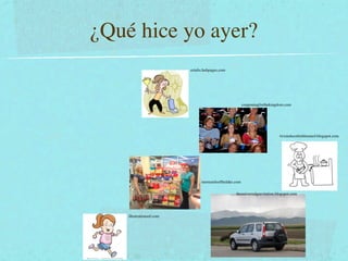 El documento presenta ejemplos de frases en el pretérito que describen acciones pasadas como "¿Qué hice yo ayer?" y "¿Adónde fui yo el fin de semana pasado?". Cada oración viene acompañada de una imagen que ilustra la acción, como ir de compras, nadar o visitar un museo.