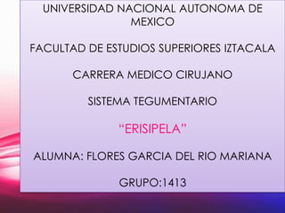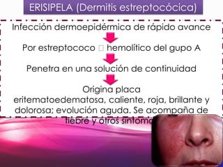El documento describe la erisipela, una infección de la piel causada por el estreptococo beta hemolítico del grupo A. Se caracteriza por una placa roja, caliente y dolorosa que evoluciona rápidamente. Afecta principalmente a mujeres adultas y puede complicarse con abscesos o gangrena. El tratamiento consiste en reposo, aplicación de compresas, y antibióticos como penicilina o dicloxacilina durante 10 días para eliminar la bacteria.