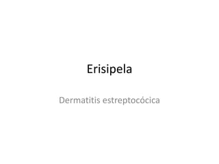 Este documento describe la erisipela, una infección de la piel causada por el estreptococo del grupo A. Afecta principalmente la cara y los pies, causando una placa roja dolorosa. Se trata con penicilina. También habla de la hidrosadenitis supurativa, una enfermedad crónica de las glándulas sudoríparas que causa abscesos recurrentes en las axilas e ingles.
