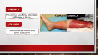 Este documento describe las infecciones erisipela y celulitis, causadas principalmente por bacterias como Staphylococcus aureus. La erisipela implica infección de los vasos linfáticos de la dermis, presentándose como una placa roja y dolorosa con bordes elevados, mientras que la celulitis implica infección de los tejidos subcutáneos y puede incluir áreas edematosas, duras y dolorosas sin bordes claros. El tratamiento incluye compresas, reposo, antibióticos como penicilina