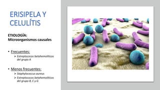 Erisipela y celulitis son infecciones de la piel causadas principalmente por estreptococos del grupo A y Staphylococcus aureus. Se manifiestan como placas eritematosas y edematosas en las extremidades inferiores y cara. El diagnóstico se realiza clínicamente y mediante muestras para cultivo. El tratamiento consiste en antibióticos como penicilinas, acido fusídico o vancomicina para tratar el problema de base.
