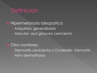 Este documento describe la hipermelanosis ideopática, también conocida como dermatitis cenicienta. Afecta principalmente a personas de piel oscura en América Latina y Asia y se caracteriza por la aparición de manchas azul grisáceas en el tronco, brazos y cuello. Las causas son desconocidas pero se cree que factores ambientales, genéticos e inmunológicos pueden estar involucrados. El tratamiento incluye corticoides tópicos, fósforo de cloroquina y protección solar, a