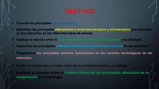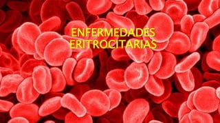 Este documento trata sobre las principales enfermedades eritrocitarias. Explica los diferentes tipos de anemia según su tamaño, color y causa, como la anemia por deficiencia de hierro, vitamina B12, folatos, enfermedad crónica y aplasia medular. También describe trastornos como la esferocitosis hereditaria, enfermedad de célula falciforme y talasemia. Por último, aborda trastornos de la coagulación como la púrpura y trombocitopenia.
