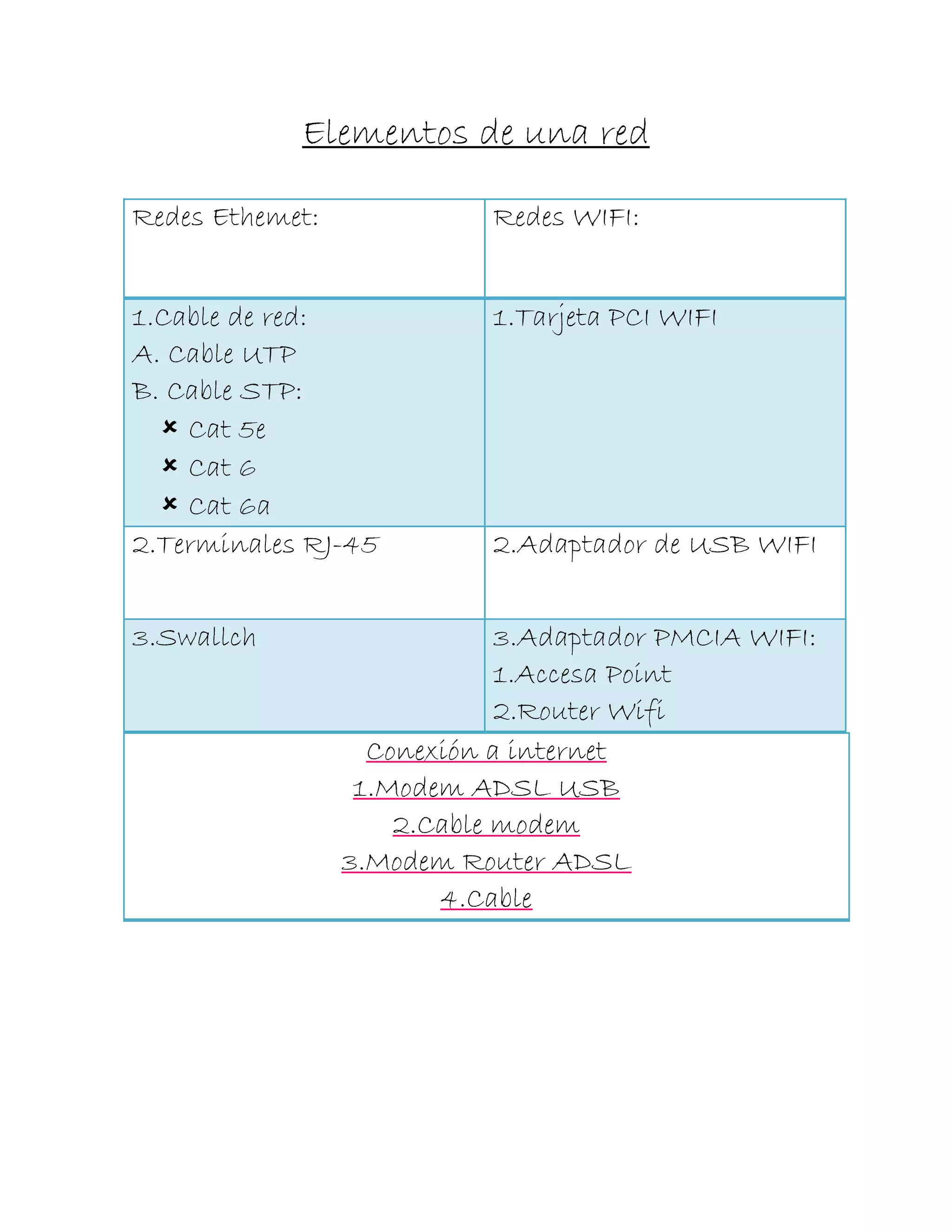 Este documento describe los elementos básicos de las redes Ethernet y WIFI. En las redes Ethernet, los elementos clave son cables de red UTP o STP, terminales RJ-45 y switches. En las redes WIFI, los elementos principales son tarjetas PCI, adaptadores USB o PCMCIA para conectarse a puntos de acceso o routers WIFI y así acceder a Internet a través de diferentes tipos de modems.
