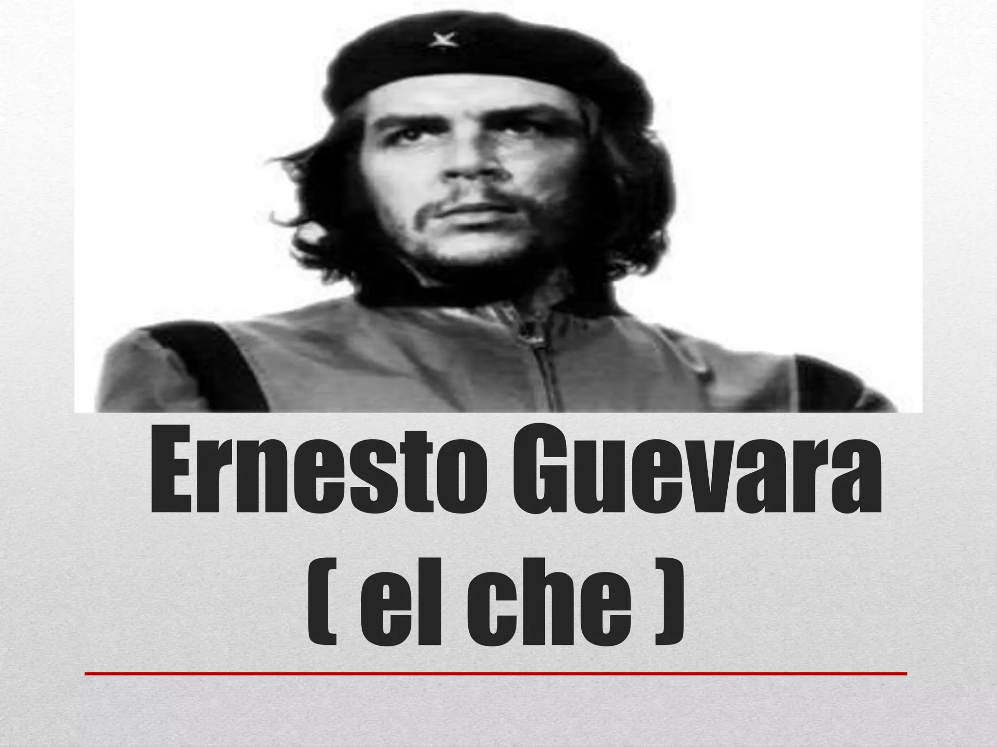 Ernesto "Che" Guevara fue un revolucionario y médico argentino que jugó un papel clave en la Revolución Cubana de 1959. Desarrolló una filosofía política conocida como "guevarismo" basada en el marxismo y el antiimperialismo, y otorgaba un papel fundamental a la lucha armada y la guerrilla. Participó en la insurrección contra la dictadura de Fulgencio Batista en Cuba y luego se desempeñó como ministro en el nuevo gobierno revolucionario de Fidel Castro. El Che defend