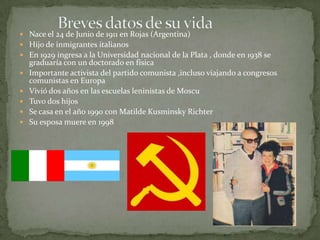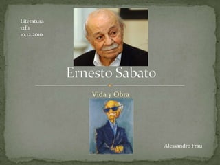 Ernesto Sabato nació en 1911 en Argentina e hizo un doctorado en física, aunque luego se dedicó a la literatura. Publicó su primera novela "Uno y el universo" en 1945 y sus novelas más famosas fueron "El túnel" en 1948 y "Sobre héroes y tumbas" en 1961. Recibió numerosos premios literarios importantes como el Premio Cervantes en 1984. Murió en 2011 a los 100 años de edad después de una prolífica carrera como novelista, ensayista y activista político.