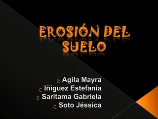 Este documento trata sobre la erosión del suelo. Explica que la erosión es el proceso de desgaste y sustracción del suelo debido a diferentes causas como el agua, el viento, las actividades humanas y los procesos geológicos. Identifica varios tipos de erosión y sus efectos negativos como la desertificación. Finalmente, enfatiza la importancia de prevenir la erosión a través de medidas como la reforestación y evitar la deforestación para proteger este importante recurso.