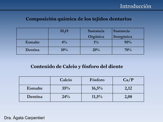 Este documento presenta un trabajo práctico sobre la erosión del esmalte dental. Explica la erosión como un fenómeno de disolución del esmalte sin intervención de bacterias, causado por sustancias ácidas. Detalla los primeros signos de erosión y diferentes tipos como las causadas por reflujo gástrico. Presenta el pH de algunas bebidas y describe el uso de ácido fosfórico para grabar el esmalte en el laboratorio. Los objetivos del trabajo práctico son comprender la erosión, establecer diferencias con la