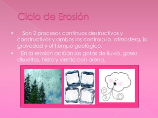 El documento describe los procesos de erosión e intemperismo. La erosión incluye etapas destructivas y constructivas controladas por la atmósfera, gravedad y tiempo geológico. Los principales tipos de erosión son la erosión pluvial, fluvial, marina, glacial y eólica. El intemperismo ocurre a través de la destrucción mecánica y la alteración química, incluyendo la acción del congelamiento, la liberación de presión y el crecimiento de sales de cristal. El intemper